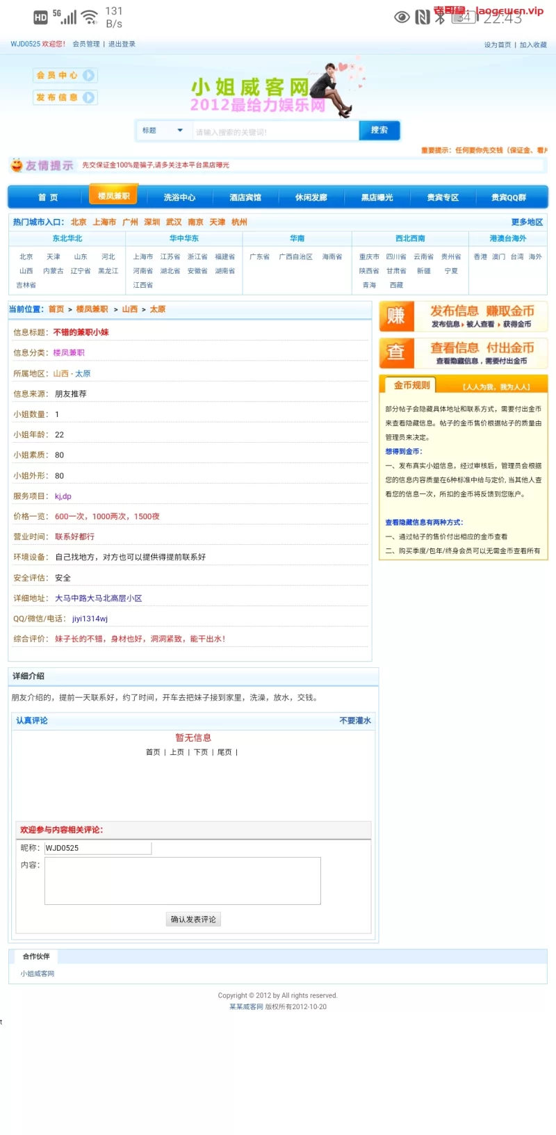 信息分类:骗子曝光 地区:山西-太原 信息来源:本网站 小姐数量:1 小姐年龄:19 小姐素质:差 小姐外形:差 服务项目:口做 价格:600 营业时间:全天 环境设备:自己家 安全评估:差 详细地址: (管理提示:经用户举报,此信息有诈骗行为,请勿被骗!) 联系方式: (管理提示:经用户举报,此信息有诈骗行为,请勿被骗!) 综合评价:极差 详细介绍: 三点联系好八点见,结果直到9点快十点才来,照片P的很厉害,垃圾身材,态度极差,啥服务都没有,往那里一躺动都懒得动,还不给亲和口,md气死我了,射都射不出来钱倒是一分不少的收走了,md气死我了 骗子曝光