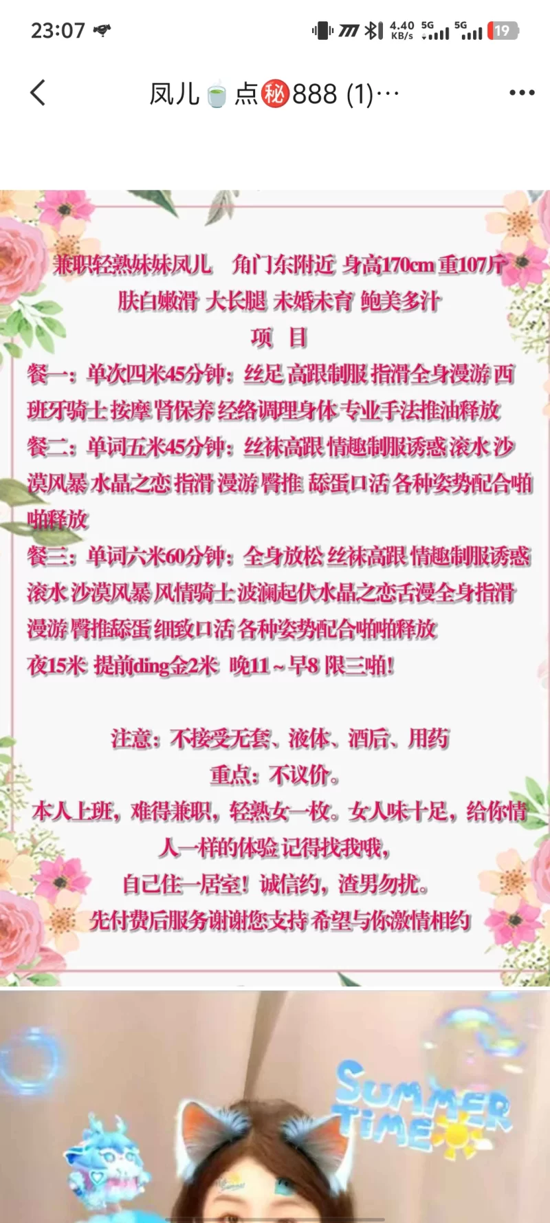 威客管理提示:要求付定金 保证金的,总之提前要钱的都是骗子 姑娘年纪比较小,23,作息非常规矩,有自己的工作,算是兼作此事。态度很好,服务细致。练习舞蹈柔韧性好,耐力好,各种姿势十分配合,绝对有点小情人的感觉。