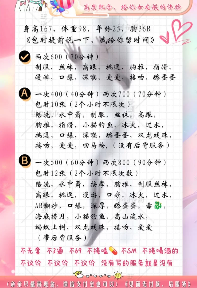 服务项目: 口爆,毒龙,接吻,胸推