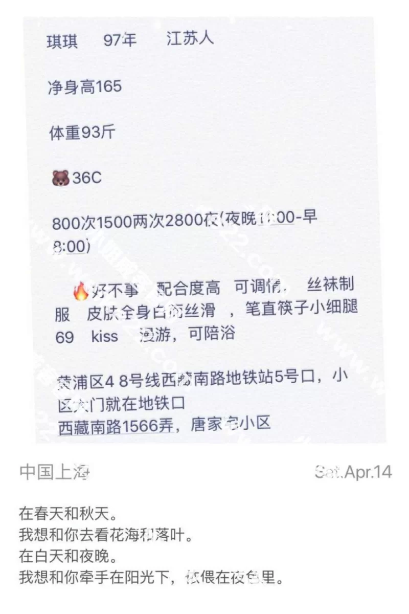 具体细节写之前,小狼先吐吐槽啊。小狼来上海已经两个月了,一直没找到好的场子,于是就把目光转向了lf市场,话说上海的lf确实多啊,不过假的也多,用来约炮的qq号天天都有人在加好友,一大半都是假的。20号晚上原本约好一个妹妹,到了地方后,差点被骗,很是郁闷。好了,言归正传,开始讲讲这次的美妙经历吧。乖乖妹子是上海的一个朋友推荐的,说是服务很好,身材很棒(我们都是美腿控),于是迫不及待的加了好友,进空间先看照片,额,照片上看来有点舒淇的感觉,而且身材确实不错。又是朋友推荐的,于是锁定目标了,开始跟妹妹聊天,告知说每天只接待几个客人,约够了人晚上六点就下线了,于是小狼就跟mm约好大搞是晚上八点半左右到。查好具体路线后,出发!话说肇嘉滨地铁站也够大的,从出了地铁到走出2号出口大概走了5分钟。到了清真路给妹妹打电话,遥控至房间。一进门,便是一股香气袭来,房间的家具都是白色的,给人很干净的感觉。妹妹穿的很休闲,感觉妹妹比照片上的还要瘦,个字大概在165左右,关键是瘦而显得腿长啊。进了妹妹的房间,妹妹看我出了很多汗,便说等我消消汗,再去洗澡。于是先是一顿闲聊,小狼想起说在微信上妹妹要穿丝袜的,于是提出要求,妹妹便说等洗澡了以后再穿吧,要不还得脱。等汗出的差不多了,一起去洗澡。浴室不是很大,但是毛巾什么的都是分开的,而且洗澡的时候妹妹也很温柔,很享受。洗完澡后,躺倒床上,便开始享受服务了。妹妹一边穿着丝袜,一边抱怨说买的是均码的,她太瘦了,很听话的穿上了黑丝,额,确实不错。也许每个人的审美观不同吧,我喜欢的美腿便是mm的这双,瘦且直,不知道跟论坛里的普陀羽毛比起来如何。开始服务,先是xx,然后my,再接着是口活。值得称赞的是口活,毫无齿感,而且很卖力,才没吸几下,就让小狼有了冲动的感觉,果断喊停,稍微休息一下后,带套提枪上阵了。mm先是问:是我在上面还是她在上面,小狼选择了女上位,便开始xxoo了。做了一段时间后,小狼想起朋友说跟乖乖最享受的姿势是后入式,于是换个姿势,让mm撅起pp,从后面插入,确实很有感觉,因为mm的双腿修长啊!在射出千万子孙后,mm很乖巧的给小狼擦拭干净,此时mm的电话响了,额,看来不能享受爱爱后短暂的温存了,在抽完一根烟后,穿好衣服,扔下四米,闪人鸟。